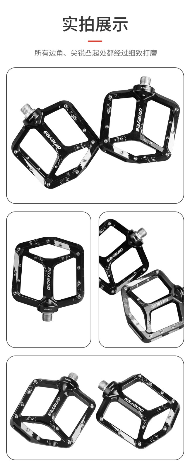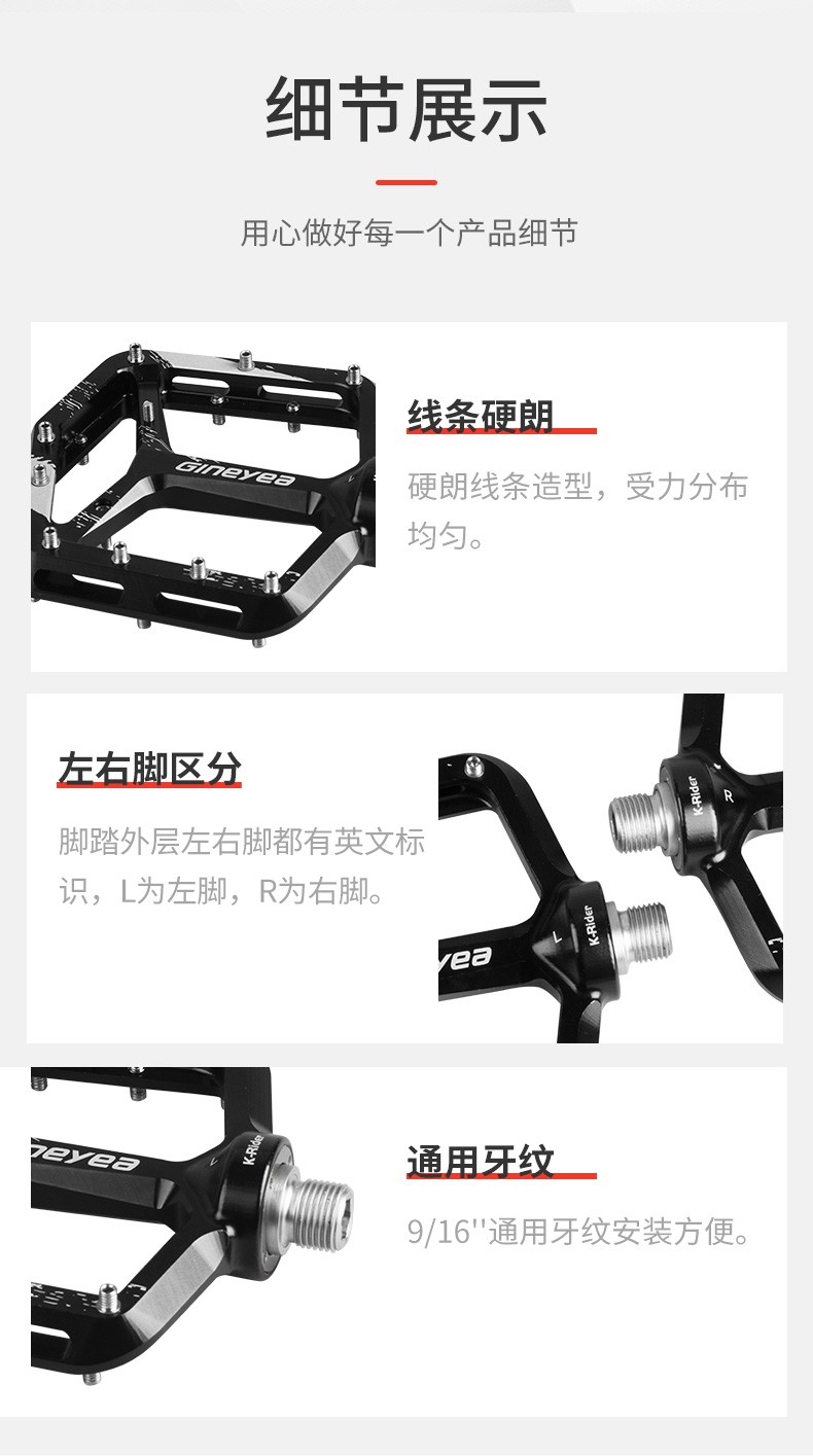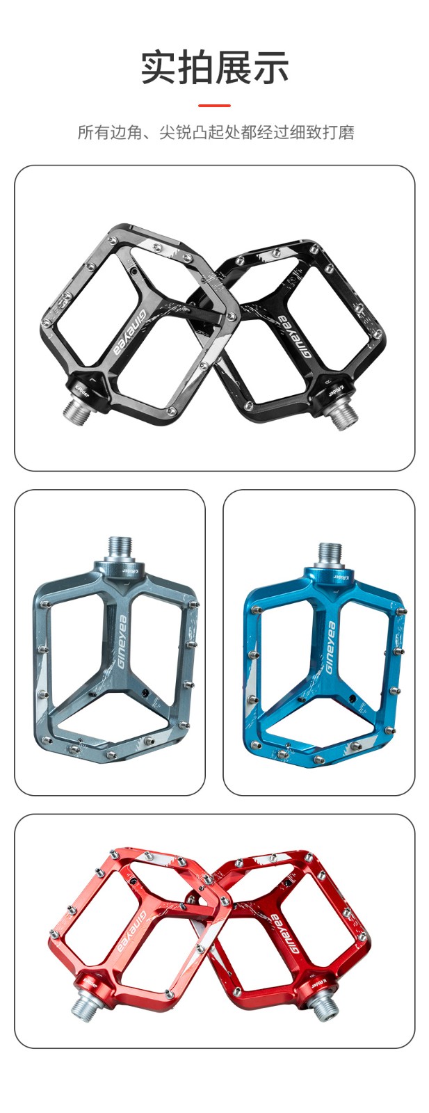 產(chǎn)品描述:景曄新款C6系列外觀設(shè)計比較個性化,造型設(shè)計相同,采用嵌套軸心的一個設(shè)計,所有邊角尖銳凸起除都經(jīng)過細(xì)致打磨,鋁合金CNC本體,珞鉬鋼軸心,騎行更省力,采用大軸承+襯套的一個設(shè)計,尺寸分大中小,大號用于速降,中號用于CX,林道,泵道,小號用于童車