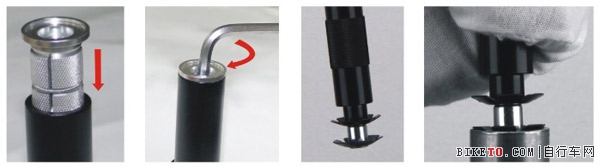 若是碳纖前叉一般選用膨脹花,把膨脹花螺絲松到可以放進(jìn)前叉立管,如圖1;再用6mm扳手把螺絲鎖緊,如圖2。
