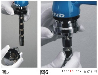 3.2 在穿入下碗時(shí),請(qǐng)注意下碗碗口向下方,并把組裝工具下培林座也穿入工具主軸螺桿同時(shí)卡好檔片,如圖5、圖6。