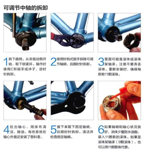 如果中軸狀況良好,潤滑后可以重新安裝使用。不過安裝后需要調(diào)節(jié)。裝入可調(diào)節(jié)軸碗,感覺到有點阻力即可。此時軸心應(yīng)該沒有曠量。如果必須繼續(xù)上緊可調(diào)節(jié)軸碗才能消除曠量,就應(yīng)該更換整個中軸系統(tǒng)了。如果沒有問題,安裝鎖緊環(huán),固定可調(diào)節(jié),軸碗不動,上緊鎖緊環(huán)。檢查軸心是否能順暢轉(zhuǎn)動,然后重新安裝曲柄。調(diào)節(jié)過程可能需要重復(fù)幾次。