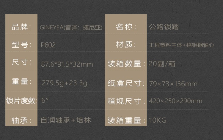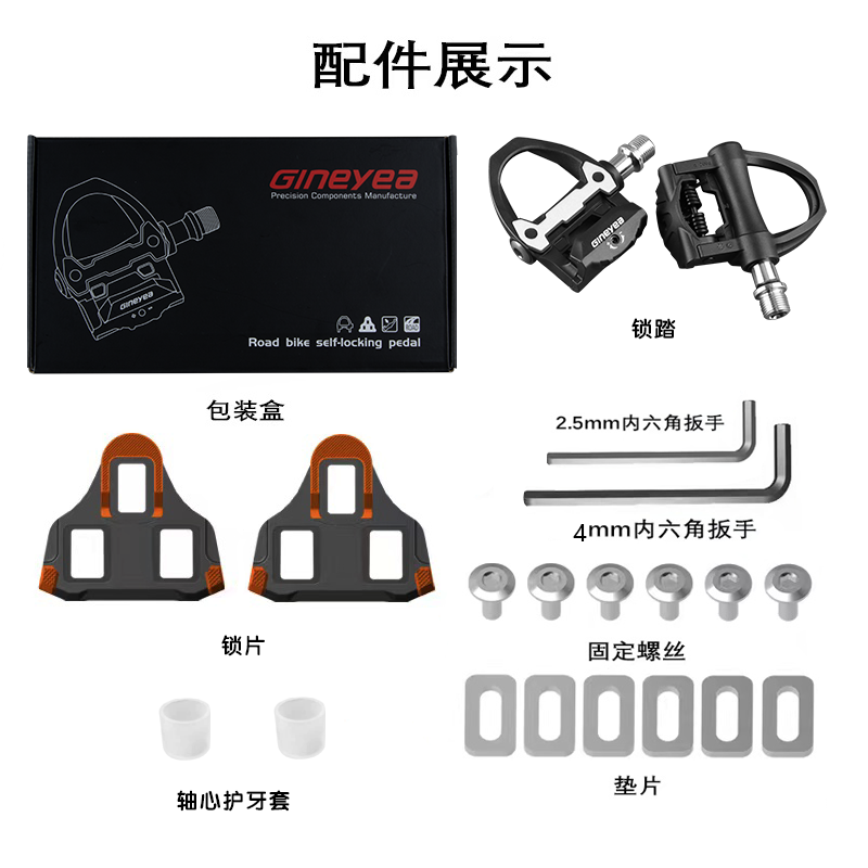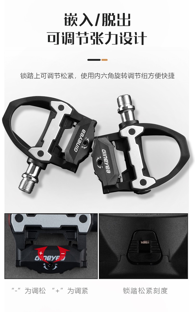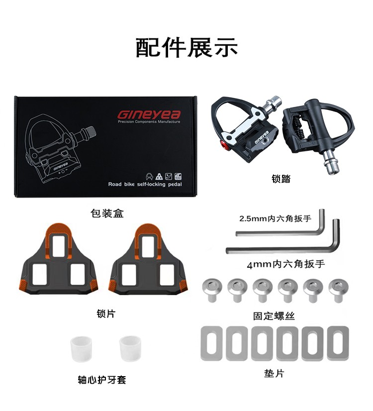 產(chǎn)品描述:品牌:GINEYEA(捷尼亞) 型號:P602 品號:13010426 品名:公路車鎖踏PRO(附鎖片6°)黑色執(zhí)行標(biāo)準(zhǔn):ISO4210 工藝:本體及扣片注塑成型材質(zhì):本體及扣片為工程塑料 軸心為鉻鉬鋼 顏色: 黑色/紅色/淺藍(lán)/橙色#公路車專業(yè)自鎖鎖踏,適用SPD-SL系統(tǒng),自帶鎖片體驗(yàn)不一樣的騎行速度、穩(wěn)定、省力,踏板流線型一體化設(shè)計(jì),高強(qiáng)度質(zhì)量輕的尼龍材料加持,一對鎖踏僅重約278g,鎖片重量約88g,松緊度可調(diào)節(jié)的張力設(shè)置,靈...